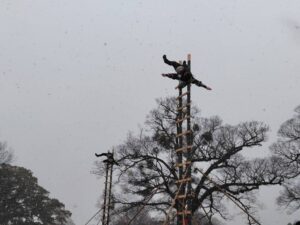 出水第10消防分団15名も分列行進により参加しました。式典のあと太鼓、音楽隊、木遣り唄、はしご乗り、纏振りなどがあり最後に吹雪の中で各分団の可搬ポンプ32台により熊本城に向って一斉放水が行なわれ